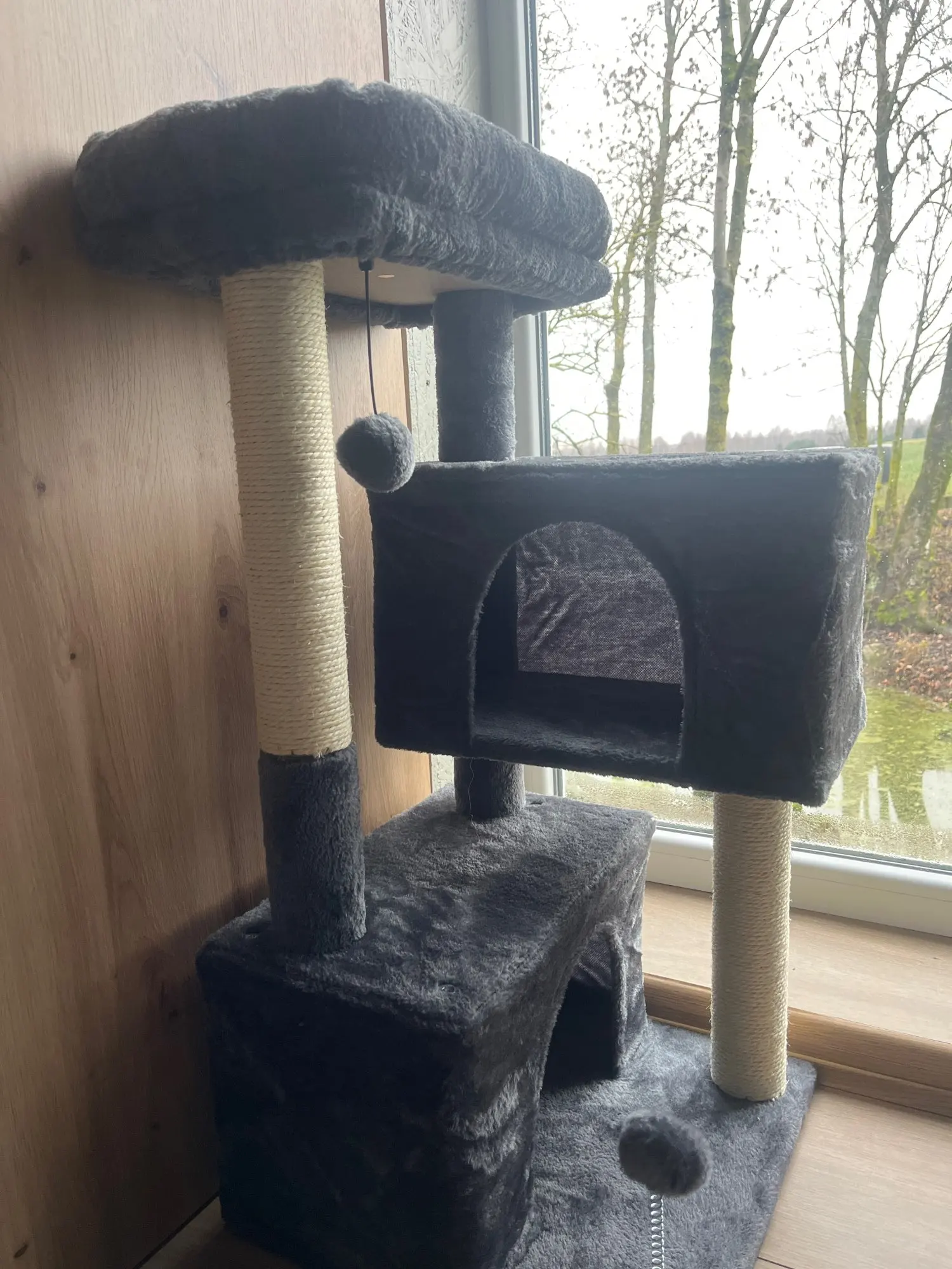 Double the Fun with Two Pompoms: Equipped with two playful pompoms, this cat tower offers double the entertainment for your cats. These dangling toys encourage active play and help keep your cats engaged and stimulated, providing hours of fun.